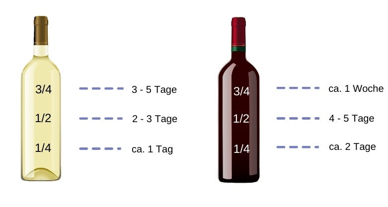 Je weniger Restwein in der Flasche ist, desto mehr Luft ist darin enthalten. Das bedeutet, dass der Wein rascher oxidiert und weniger lange haltbar ist als eine Flasche, die noch fast voll ist. An dieser Grafik kannst du dich orientieren, wie lange Weißwein oder Rotwein je nach Füllstand im Kühlschrank haltbar ist.