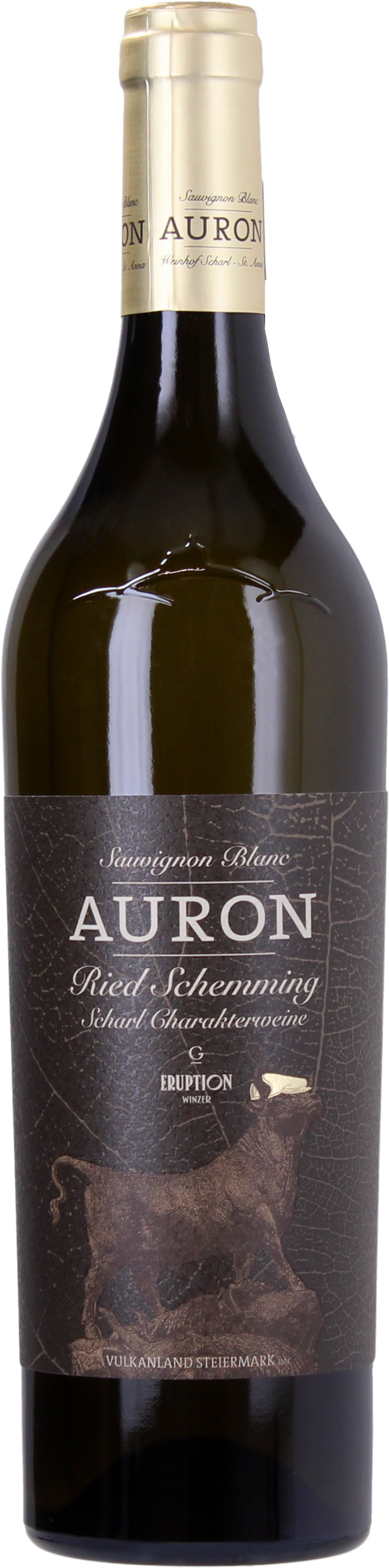 Auron, der Stier, ziert mit seinem goldenen "Kapperl" das Etikett dieses kraftvollen und facettenreichen Weines. Er steht als Sinnbild für den Wein und trägt Josef Scharls Markenzeichen (das Kapperl) am Kopf. Ein Flaggschiff und Aushängeschild des Betriebes.
